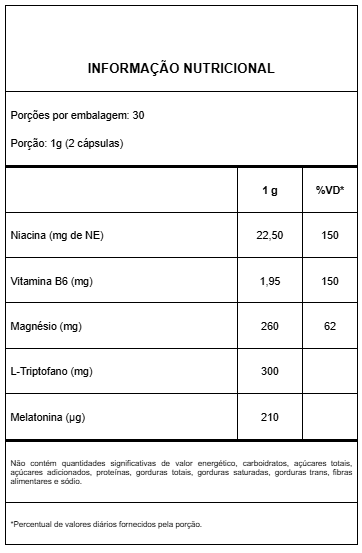 Cada porção de 2 cápsulas (1 g) possui 22,5 mg de Niacina, 1,96 mg de Vitamina B6, 260 mg de Magnésio, 300 mg de L - Triptofano e 210 mcg de melatonina.